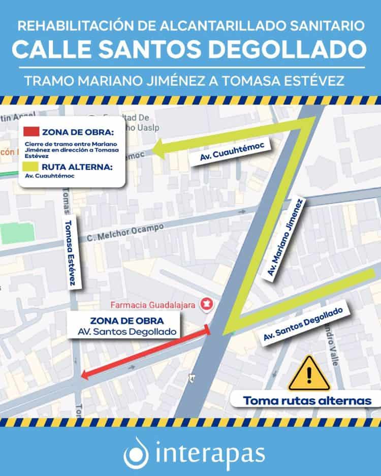 El Organismo Intermunicipal de Agua Potable, Alcantarillado y Saneamiento (Interapas) informó que mantiene el cierre de un tramo de la avenida Santos Degollado por obras.
