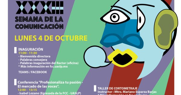El rector de la UASLP, Alejandro Zermeño Guerra; la directora de la FCC, Adriana Ochoa y la consejera alumna. Laura Aguilar inaugurarán las actividades hoy a las 11:00 horas. Posteriormente, a las 12:00 horas en el auditorio de la facultad se efectuará la conferencia-taller “Profesionaliza tu pasión. Oportunidades de negocio en el mercado de las voces”, impartida por la locutora comercial Isabel Lozano, egresada de la FCC.
