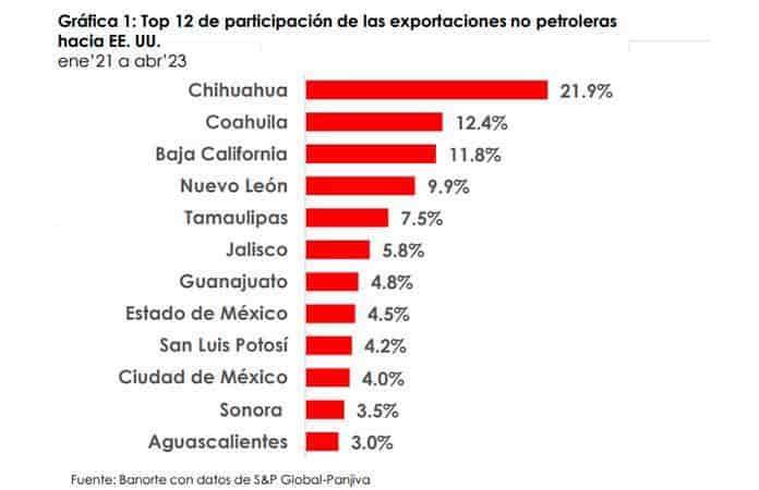 El reporte “Zoom Nearshoring II La fuerza de la proximidad: el impacto económico del nearshoring desde un enforque regional” publicado a mediados del mes pasado por la institución bancaria señala que doce estados del país concentran el 95% de las exportaciones no petroleras del país.