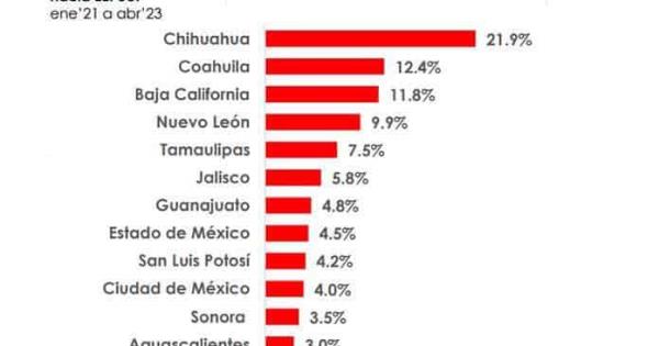 El estado supera a la Ciudad de México, Sonora y Aguascalientes. El listado es encabezado por Chihuahua, que concentra el 21.9 por ciento, seguido por Coahuila y Baja California, que tienen el 12.4% y el 11.8%, respectivamente.