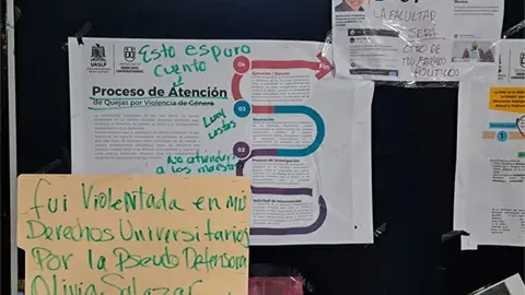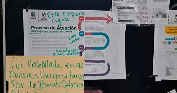 La aspirante a la Dirección de la Facultad de Derecho de la UASLP, Luz María Lastras Martínez, denunció la colocación de cartelones dentro de la facultad con insultos y caricaturas en su contra, en medio del conflicto que rodea el proceso interno para designar a la próxima dirección.