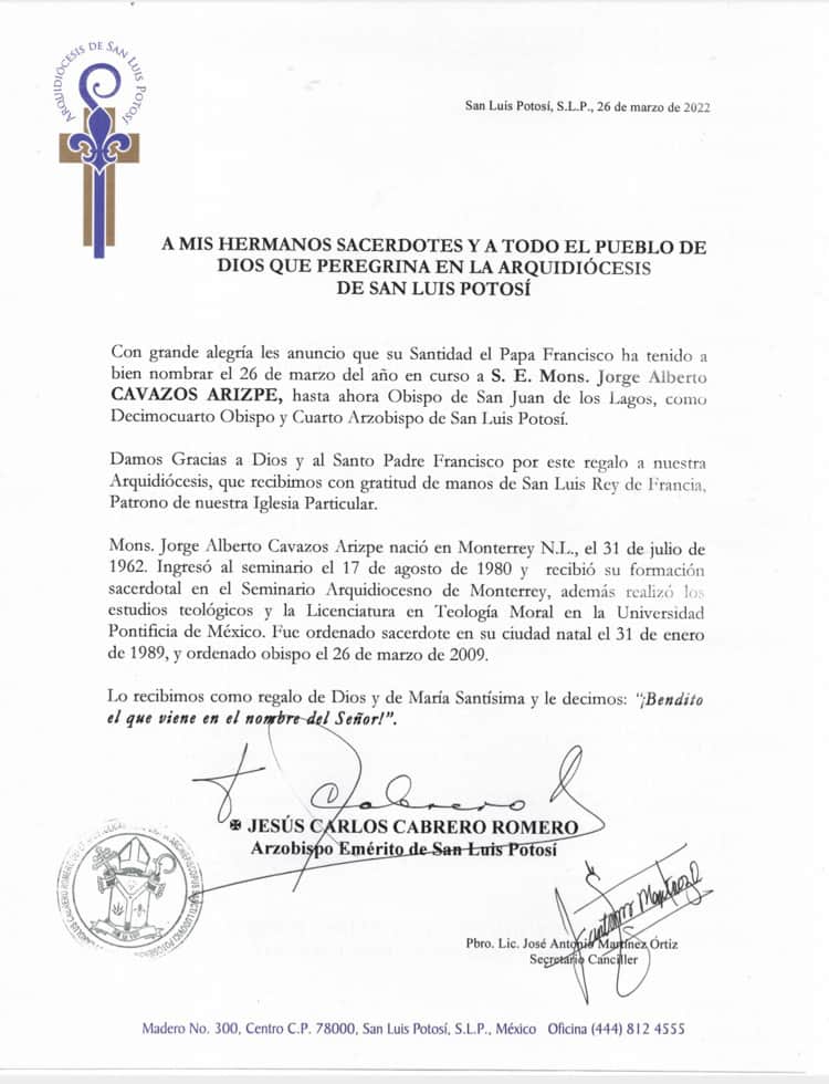 En una breve carta, el ahora arzobispo emérito de San Luis Potosí, Jesús Carlos Cabrero Romero, anunció a los sacerdotes en forma oficial, el nombramiento del antes obispo de San Juan de los Lagos, Jorge Alberto Cavazos Arizpe, como el cuarto arzobispo de San Luis Potosí.