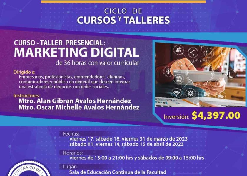 La Facultad de Ciencias de la Comunicación de la Universidad Autónoma de San Luis Potosí (UASLP) invita a periodistas, comunicadores, profesionistas afines y público interesado a inscribirse al Curso-Taller: Marketing Digital, con duración de 36 horas y valor curricular.