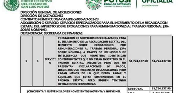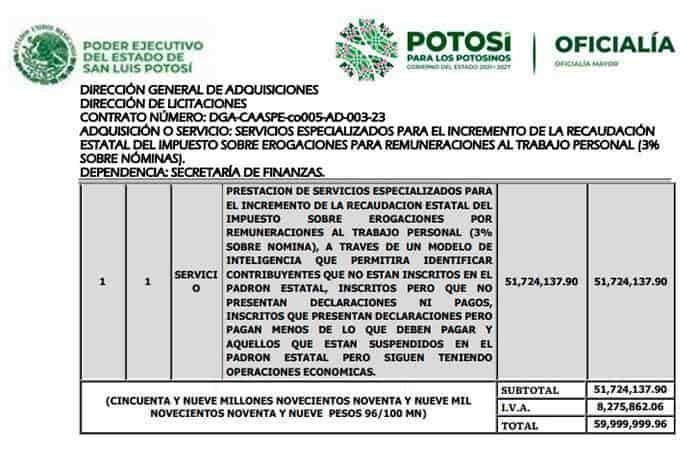 El objeto del contrato es el de “servicios especializados para el incremento de la recaudación del ISERT (3% sobre nómina) a través de un modelo de inteligencia”.