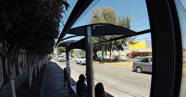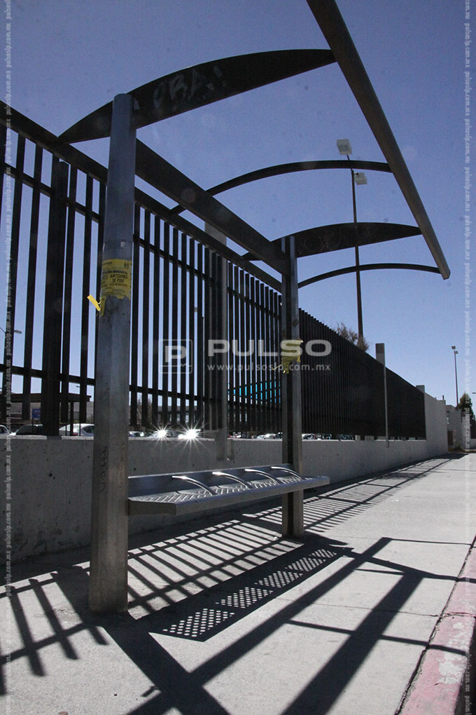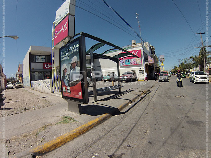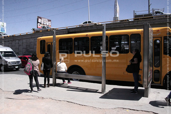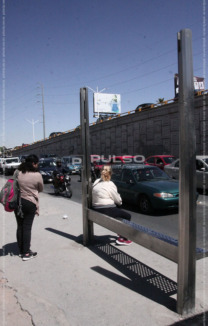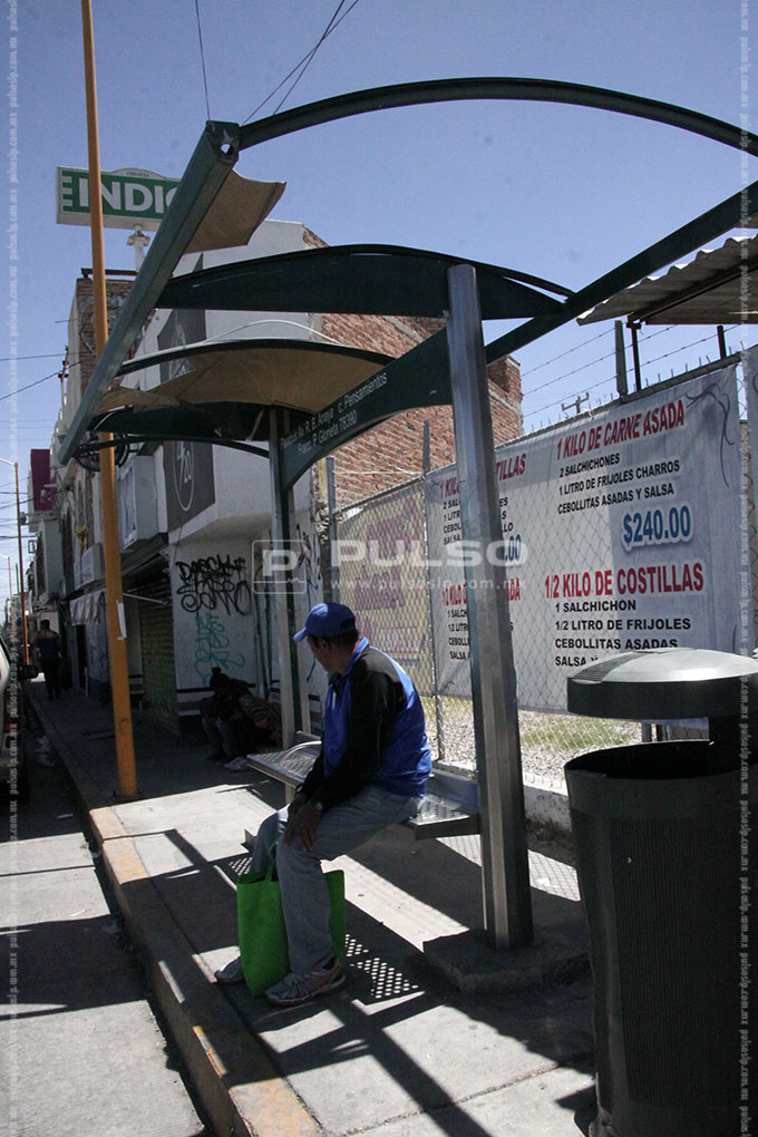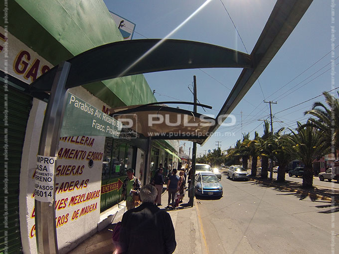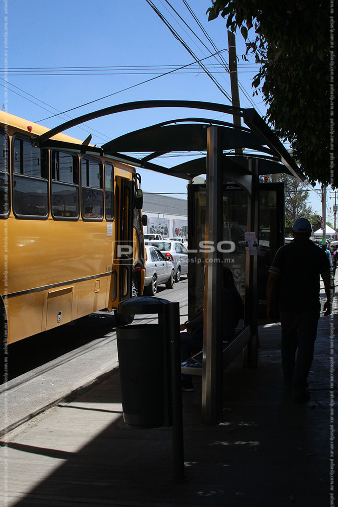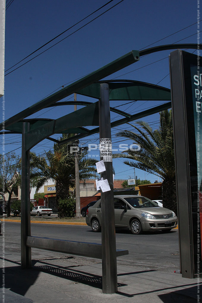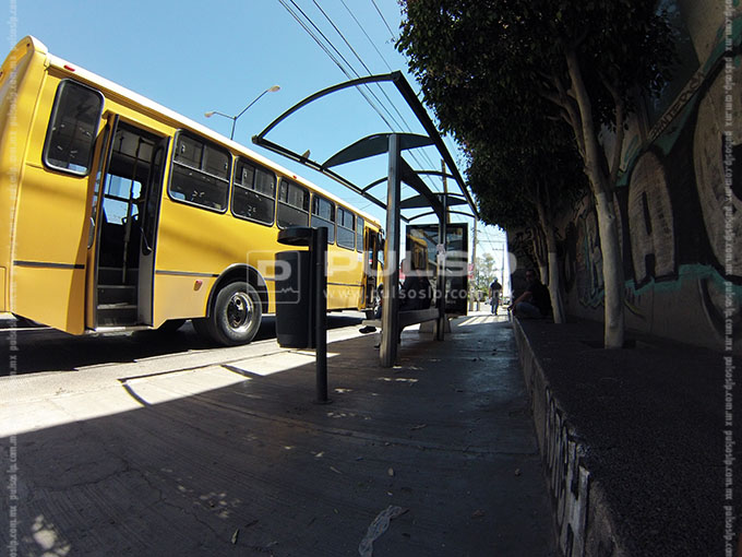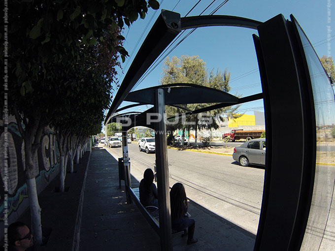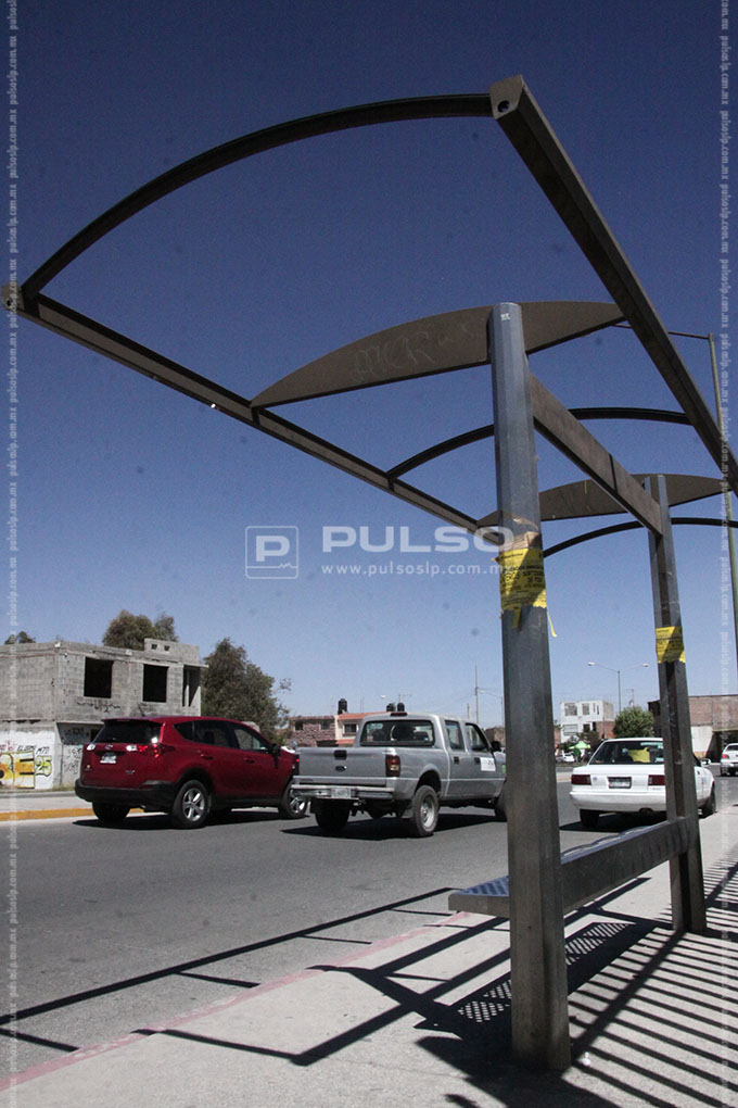 En avenida Salvador Nava, a la altura de avenida Salk, los usuarios de camiones urbanos se agrupan bajo una estructura metálica residual sin techo, lo mismo ocurre en el paradero ubicado en avenida Industrias casi esquina con Dalias.