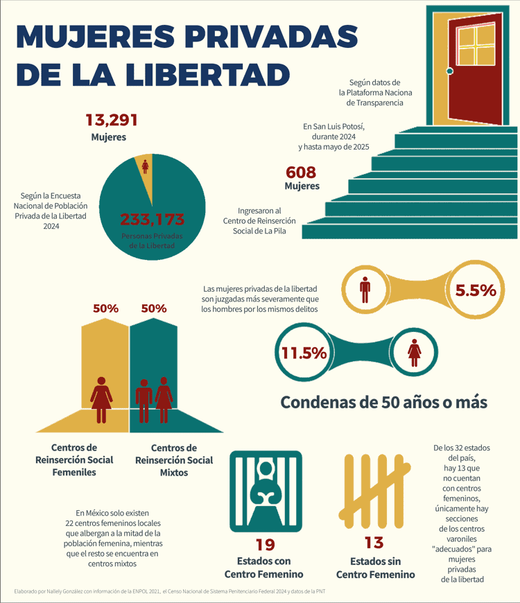 Según la Encuesta Nacional de Población Privada de la Libertad 2024 (Enpol), al cierre de 2023 había 233 mil 173 personas privadas de la libertad, de las cuales 13 mil 291 eran mujeres. En San Luis Potosí, durante 2024 y hasta mayo de 2025, ingresaron a la prisión de La Pila 608 mujeres, de las cuales 324 siguen en reclusión.