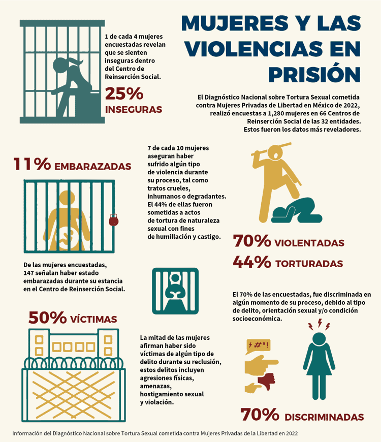 Las paredes de los centros de privación de libertad, a menudo invisibles para la sociedad, guardan realidades brutales. Un reflejo de esta situación se encuentra en el Diagnóstico Nacional sobre Tortura Sexual cometida contra Mujeres Privadas de Libertad en México de 2022, el estudio revela que una de cada cuatro mujeres se siente insegura dentro del centro. La razón es alarmante: el 43.82% de las entrevistadas fueron sometidas a actos de tortura de naturaleza sexual con fines de humillación y castigo, mientras que un 23.59% sufrió tratos crueles, inhumanos o degradantes.