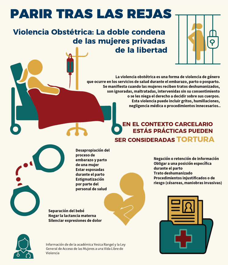 La violencia obstétrica es la desapropiación del proceso de embarazo y parto de una mujer; esto implica no considerar sus deseos, negarle información y, en casos extremos, llevar a la muerte de la madre o del bebé; en el contexto carcelario, esta violencia puede escalar al nivel de tortura, ya que las condiciones de encierro exacerban las vulnerabilidades de las mujeres, señala la doctora y académica Yesica Rangel.