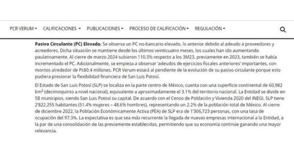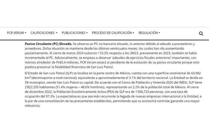 El alza del pasivo circulante fue notada desde el primer trimestre por parte de la calificadora de deuda PCR Verum en su más reciente reporte de calificación de San Luis Potosí, correspondiente al primer trimestre del año.