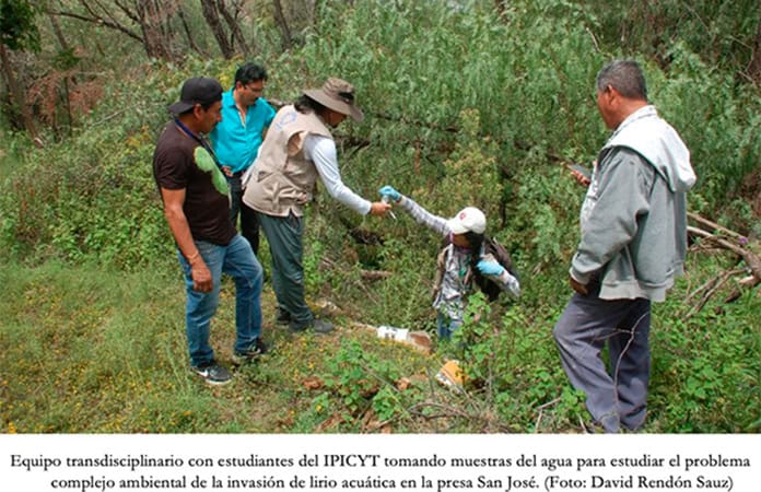 Equipo transdisciplinario con estudiantes del IPICYT tomando muestras del agua para estudiar el problema complejo ambiental de la invasión de lirio acuático en la presa San José.