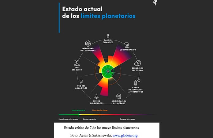 El enfoque de sistemas complejos es usado para cuantificar 9 Límites Planetarios (clima, biodiversidad, uso de suelo, equilibrio biogeoquímico, acidificación oceánica, ozono, aerosoles, agua dulce y contaminación). Son las reservas que definen el "espacio operativo seguro" para la humanidad en nuestro planeta. Cruzar estos límites es como ignorar las luces de advertencia en el tablero de un auto: de las nueve alertas, siete ya están encendidas.