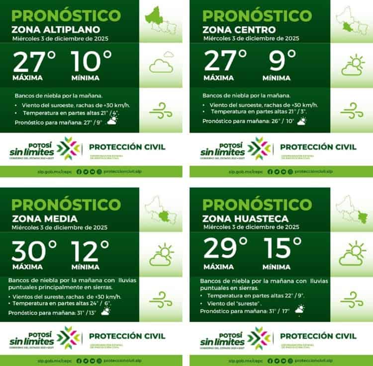 De acuerdo con el pronóstico, las temperaturas máximas serán de 27 grados en la zona centro y 29 grados en la Huasteca, mientras que las mínimas descenderán hasta 9 grados en la región centro y 10 grados en el Altiplano, condiciones que pueden afectar salud, tuberías y viviendas.