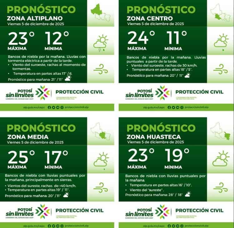Según el pronóstico actualizado, las temperaturas máximas rondarán los 23 grados en la zona Centro y 24 grados en la Huasteca, mientras que las mínimas caerán hasta los 11 grados en la capital y 12 grados en el Altiplano, donde se mantiene la posibilidad de heladas durante la madrugada.