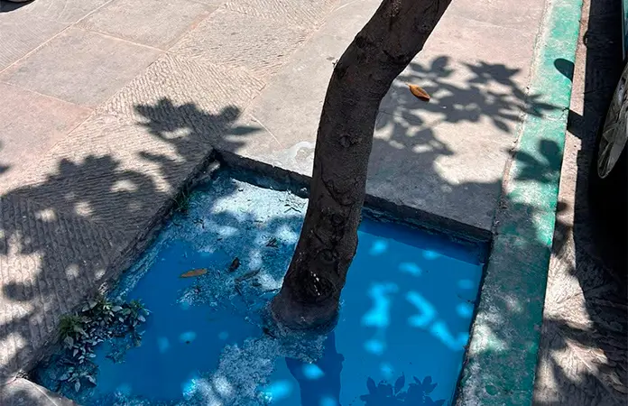 El vertido de pintura en la base de un árbol encendió la alerta sobre la calle Simón Bolívar en pleno Centro Historico, donde una magnolia resultó afectada tras trabajos de rehabilitación en un establecimiento cercano. En el sitio quedó visible una capa de residuos de pintura azul que cubrió el pedazo de tierra, contaminando el tronco y poniendo en riesgo la salud del ejemplar.