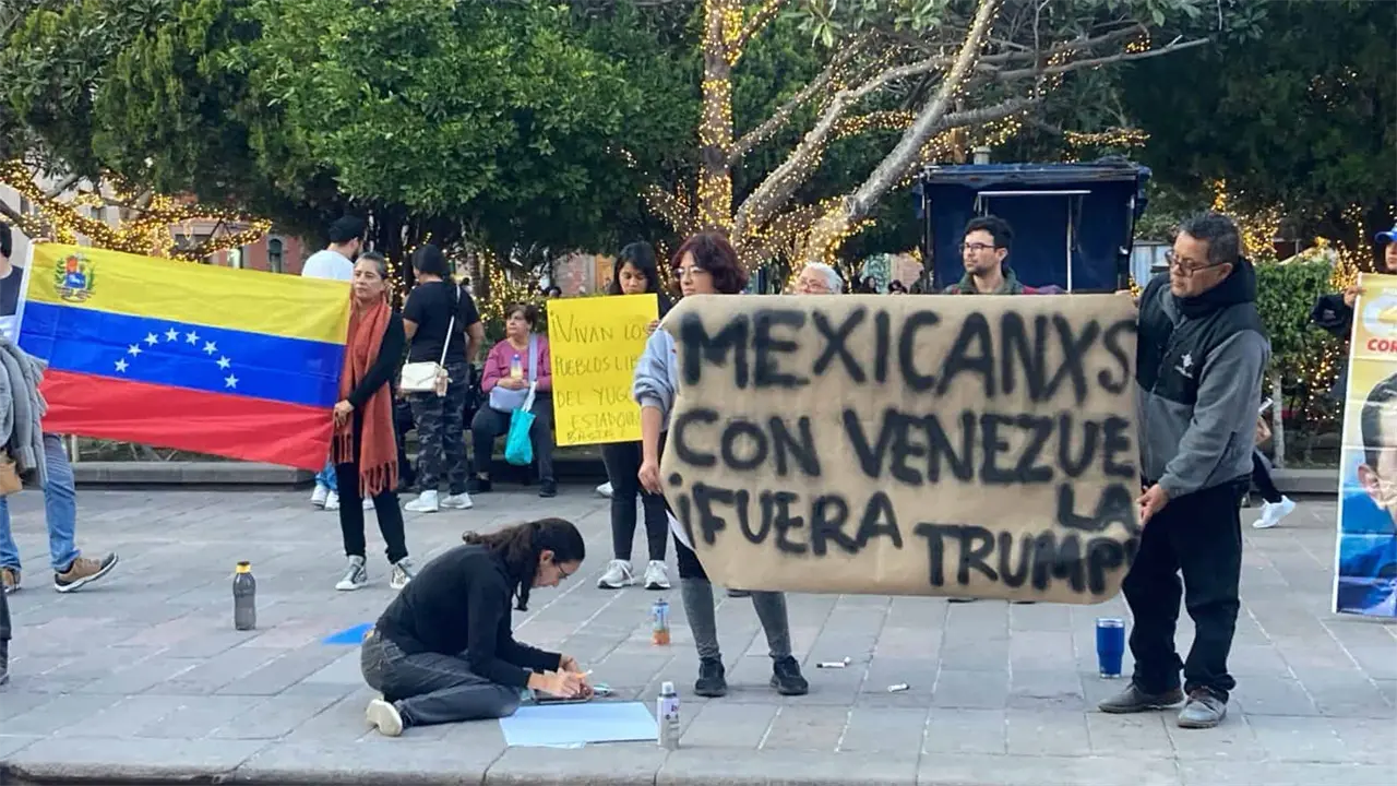 Un grupo de alrededor de 40 personas se manifestó este sábado frente al Congreso del Estado, en la Plaza de Armas de la capital potosina, para expresar su rechazo a la intervención militar de Estados Unidos en Venezuela, operación ordenada por el presidente estadounidense Donald Trump que derivó en la captura del mandatario venezolano Nicolás Maduro.