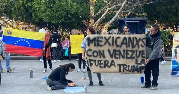 Durante la concentración, los manifestantes portaron mantas, pancartas y banderas venezolanas, con mensajes como "Mexicanxs con Venezuela", "No a la intervención" y consignas en contra del gobierno de Trump. Algunos participantes elaboraban carteles sobre el piso de la plaza, mientras otros coreaban consignas en defensa de la soberanía venezolana y contra el uso de la fuerza militar.