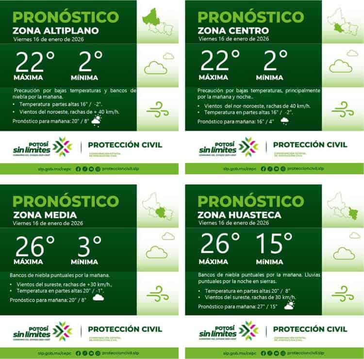 La Coordinación Estatal de Protección Civil (CEPC) informó sobre el pronóstico climático para este viernes en San Luis Potosí.