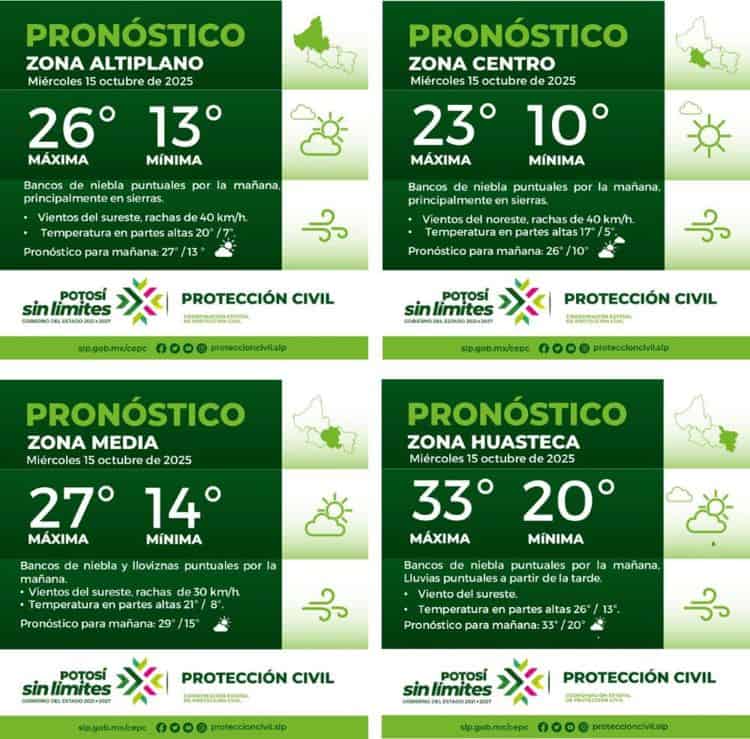 La Coordinación Estatal de Protección Civil (CEPC) informó del pronóstico climático para este miércoles en las cuatro regiones de San Luis Potosí.