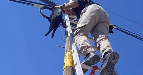 Elementos del Área Operativa de Protección Civil en la capital en conjunto con Bienestar Animal, realizaron con éxito el rescate de un felino que se encontraba en la parte más alta de un poste en la calle 5a de la Cruz, al norte de la ciudad.