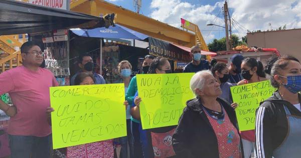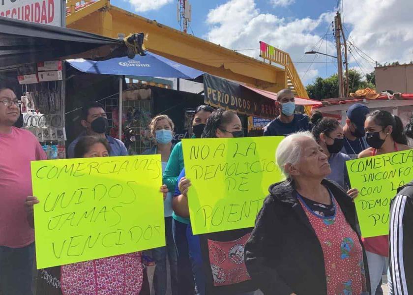 Los comerciantes se apersonaron en el crucero de la avenida reforma y la calle Moctezuma para rechazar la demolición del puente peatonal.