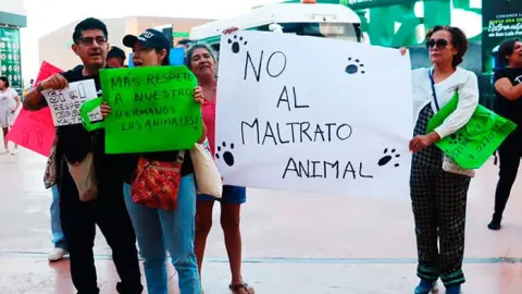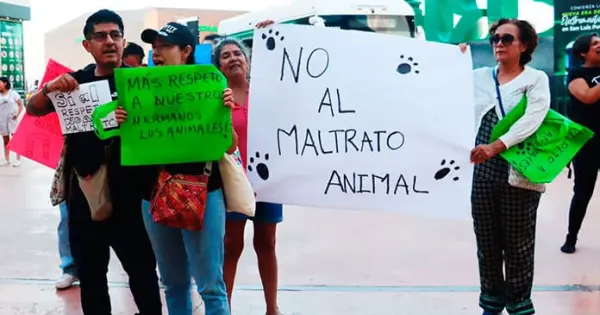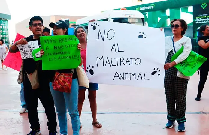 Con pancartas y consignas, los manifestantes exigieron la intervención inmediata del gobernador José Ricardo Gallardo Cardona, para impedir que los promotores del carrusel sigan explotando a los animales.