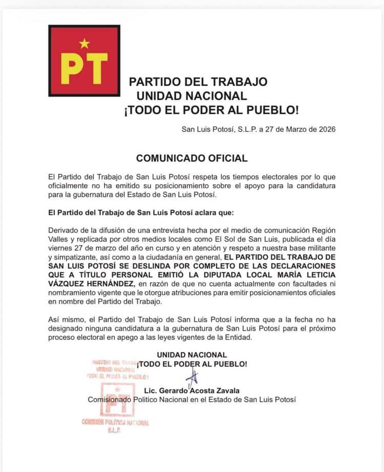 El posicionamiento, firmado por el comisionado político nacional en San Luis Potosí, Gerardo Acosta Zavala, establece además que el partido no ha definido candidatura alguna a la gubernatura y que se mantendrá en apego a los tiempos electorales, en medio de un escenario de indefinición sobre posibles alianzas en la entidad.