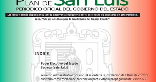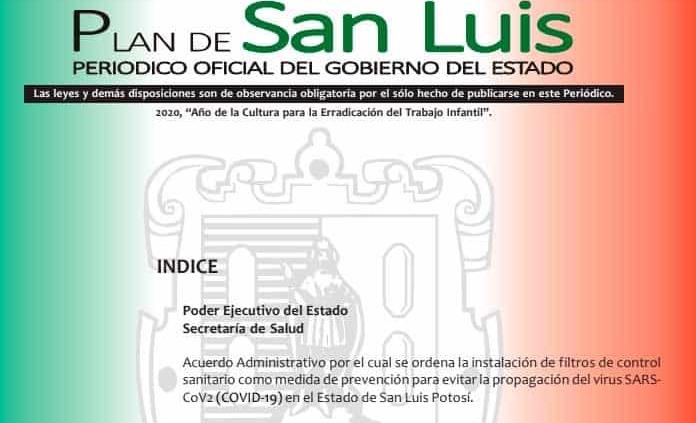 Este sábado se publicó en el Periódico Oficial del Estado el "Acuerdo administrativo por el cual se ordena la instalación de filtros de control sanitario como medida de prevención para evitar la propagación del virus SARS-CoV-2 (Covid-19) en el Estado de San Luis Potosí.