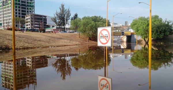 En lo que respecta al paso a desnivel de Plaza San Luis también se observó un gran encharcamiento y trabajadores intentan destapar alcantarillas para permitir el paso del agua.