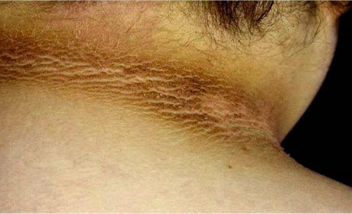 De acuerdo con expertos de esa dependencia federal, la coloración oscura se visualiza en las rugosidades del organismo, es decir, en el cuello, los codos, las rodillas, las ingles y los brazos.