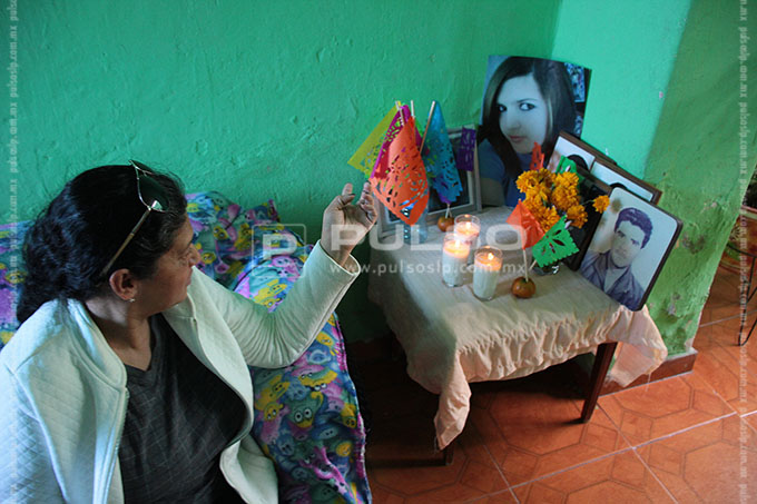 Al ser interrogada respecto a la forma en que recuerda a su hija cada Día de Muertos, Esperanza Lucciotto giró su mirada a un costado para ver el retrato de su hija, apostado en una mesa en un modesto altar, rodeada de flores de cempasúchil, banderas multicolores y tres veladoras.