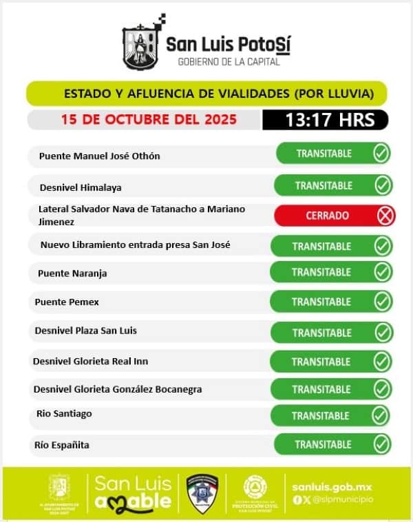 Esto, luego de las recientes lluvias en la capital. En tanto, permanece cerrada a la circulación vehicular en la lateral de Salvador Nava, de Tatanacho a Mariano Jiménez.