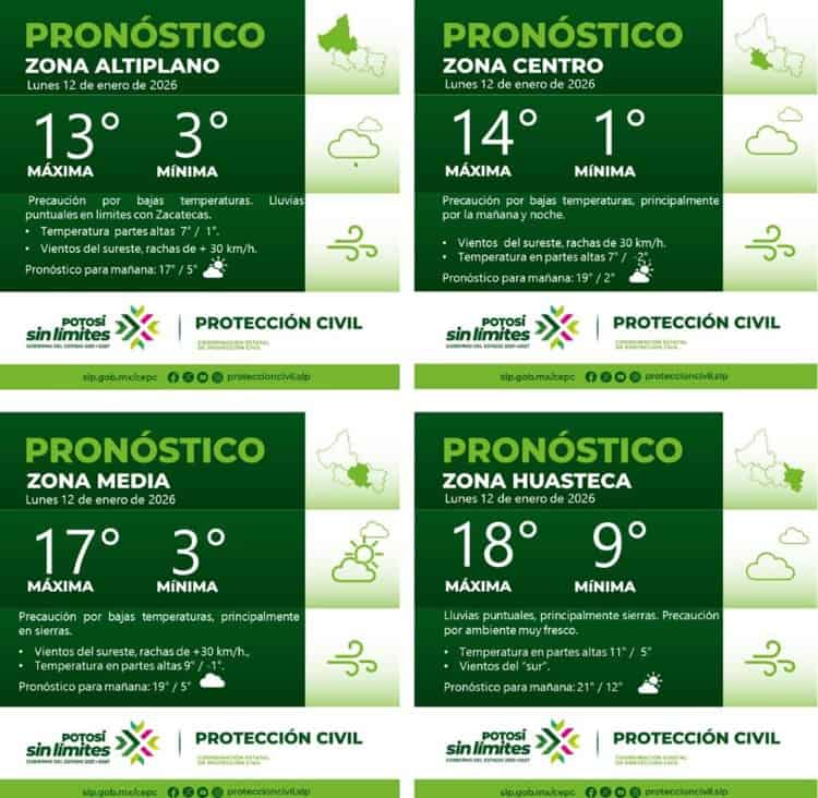 La Coordinación Estatal de Protección Civil informó que las temperaturas máximas rondarán los 14 grados en la zona centro y 18 grados en la Huasteca, mientras que las mínimas podrían descender hasta 1 grado en la zona centro y 3 grados en el Altiplano.
