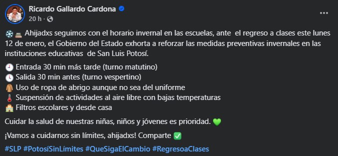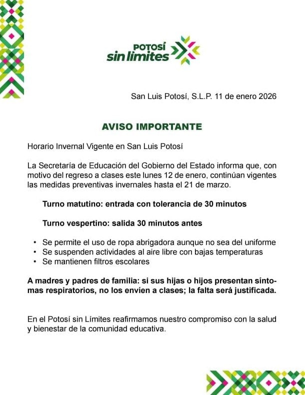 En este contexto, el gobernador Ricardo Gallardo Cardona informó a través de sus redes sociales que se mantiene el horario invernal en las escuelas, con el objetivo de reducir riesgos a la salud de estudiantes ante las bajas temperaturas.