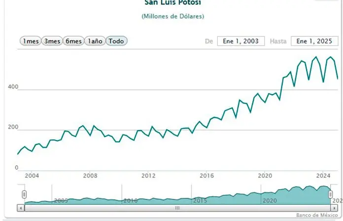 En su reporte más reciente de la captación de dólares por entidad, el Banxico señala que San Luis recibió entre enero y marzo de este año 450 millones de dólares, la cifra más baja en los últimos cuatro trimestres.