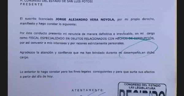 El fiscal especializado en delitos relacionados con hechos de corrupción, Alejandro Vera Noyola, presentó este día su renuncia al cargo, con el argumento de que así convenía a sus intereses y por motivos estrictamente personales.