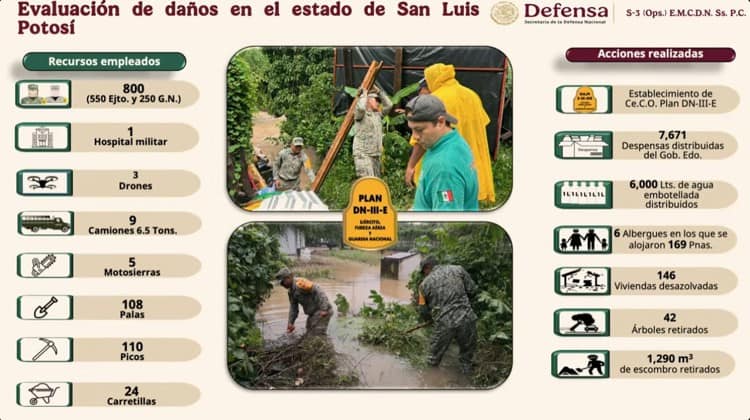 Son un total de 800 militares distribuidos, que han apoyado en 146 viviendas desazolvadas, 7 mil 671 despensas repartidas y 6 mil litros de agua distribuidos.
