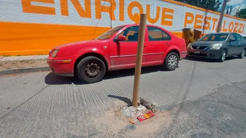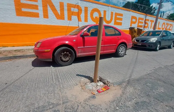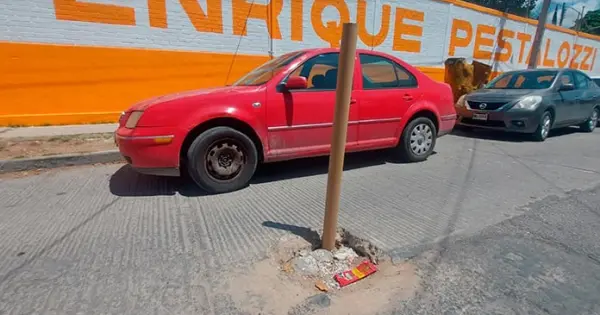 Como medida preventiva, los habitantes colocaron un tubo para advertir a los automovilistas sobre el peligro y evitar daños a las unidades que circulan por la zona.