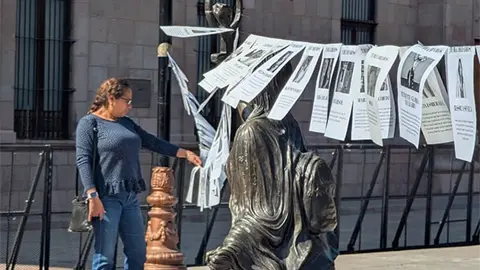 Hojas con nombres, fotos y relatos de mujeres asesinadas por violencia de género cuelgaron ayer en un tendedero junto al antimonumental en Plaza de Armas.