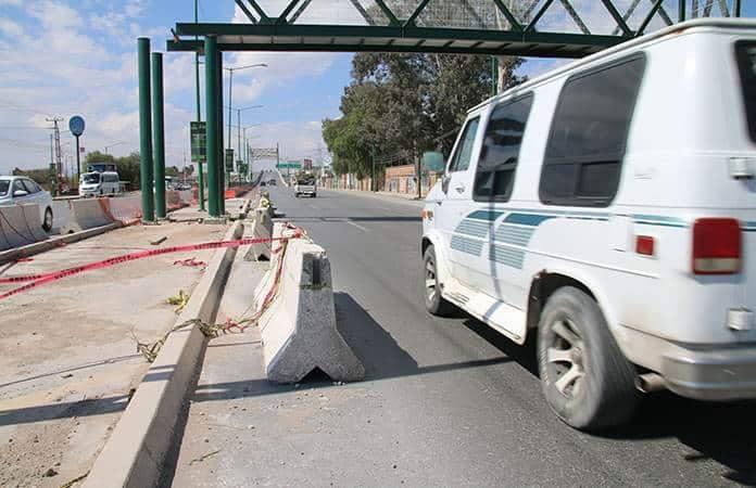 Muros de concreto invaden el arroyo vehicular como parte de la construcción del nuevo puente peatonal en el bulevar Valle de los Fantasmas, en la colonia Quintas de la Hacienda, en el municipio de Soledad de Graciano Sánchez.