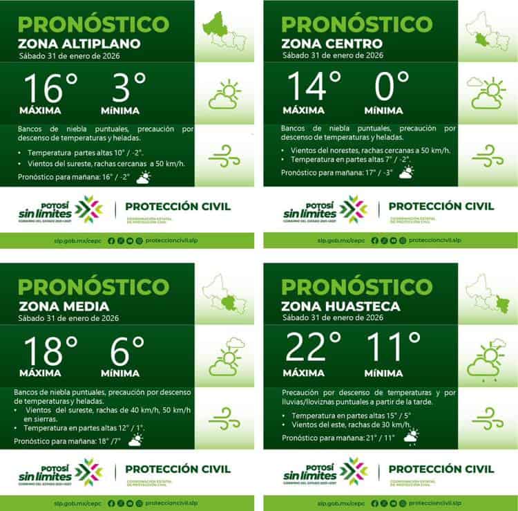 De acuerdo con información de la Coordinación Estatal de Protección Civil, las temperaturas máximas se mantienen alrededor de los 14 grados centígrados en la zona centro, mientras que en la región Huasteca alcanzan hasta los 22 grados. En contraste, las mínimas descienden hasta los 0 grados en la zona centro y 2 grados en el Altiplano, lo que incrementa el riesgo de afectaciones por frío.