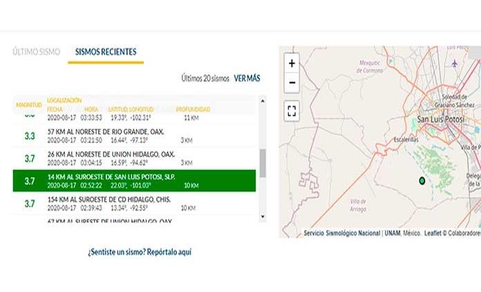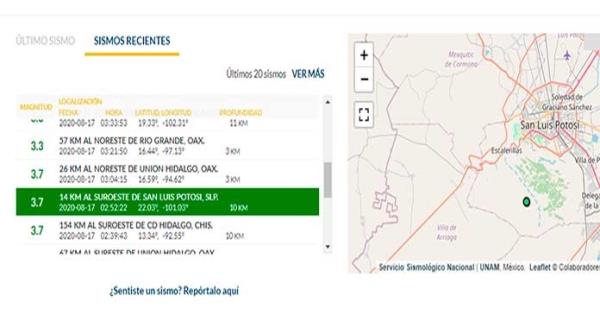 De acuerdo al Servicio Sismológico Nacional, este movimiento telúrico se registró a las 2:52 horas y tuvo como epicentro las coordenadas 22.03º-101.03º, a unos 14 kilómetros de la capital, dentro del mismo municipio, con una intensidad de 3.7.