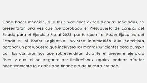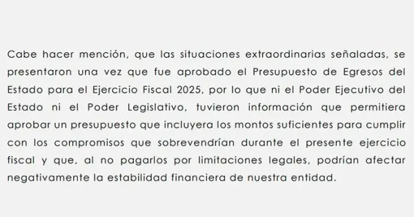 "La presente iniciativa", señala la propuesta, "pretende adecuar el marco jurídico estatal en materia de presupuesto, derivado de las situaciones extraordinarias que no pudieron ser consideradas en el Presupuesto de Egresos del Estado para el Ejercicio Fiscal 2025 y que por necesidad financiera requieren ser aprobadas por esta Honorable Legislatura".