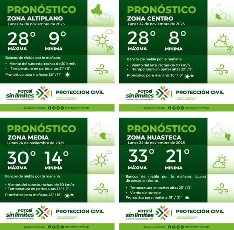 De acuerdo con el pronóstico climático oficial, las temperaturas máximas alcanzarán 28 grados en la zona centro y hasta 33 grados en la Huasteca, mientras que en las sierras de esta última región se esperan lluvias y lloviznas dispersas.