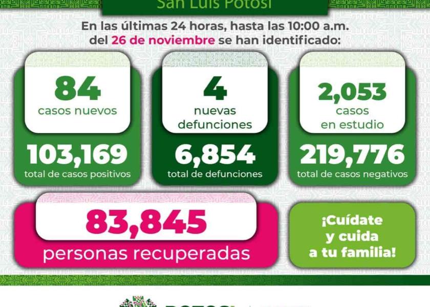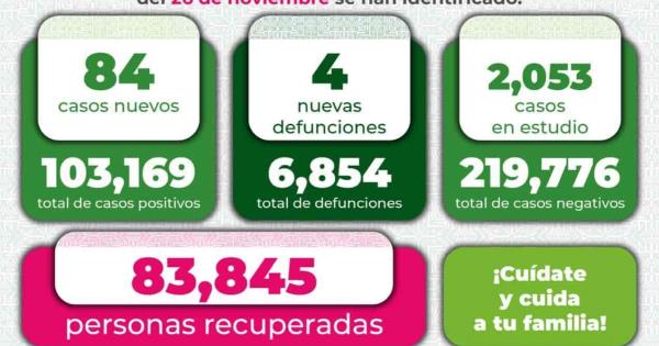Los Servicios de Salud y el Comité Estatal para la Seguridad en Salud, informaron que hasta este viernes 26 de noviembre se registran 103 mil 169 casos totales de Covid-19, con la confirmación de 84 nuevos contagios de acuerdo al reporte epidemiológico de las últimas 24 horas.
