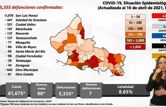 San Luis Potosí acumula este sábado 61,675 casos de covid, tras confirmarse 88 nuevos contagios en las últimas 24 horas.