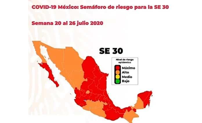 Mientras que las 18 entidades federativas que se mantienen en semáforo rojo, es decir, que solo se podrán realizar actividades esenciales son: Baja California Sur, Coahuila, Nuevo León, Tamaulipas, Zacatecas, San Luis Potosí, Nayarit, Jalisco, Colima, Guanajuato, Querétaro, Hidalgo, Puebla, Veracruz, Oaxaca, Tabasco, Yucatán y Quintana Roo.