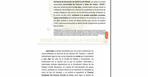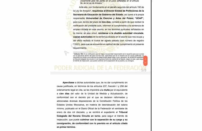 El 4 de junio del presente año, el Juzgado Sexto de Distrito emitió la sentencia del caso en la que le otorgó a la Universidad de Ciencias y Artes del Potosí 30 días para realizar y concluir las gestiones.