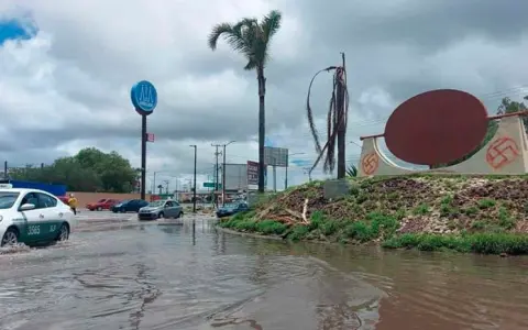 La Secretaría de Desarrollo Urbano, Vivienda y Obras Públicas de gobierno del estado se olvidó de soluciones pluviales en la zona de construcción del puente vehicular en la carretera a Rioverde. El acceso al fraccionamiento Hacienda Los Morales se convierte en una “alberca gigante”de agua pluvial.