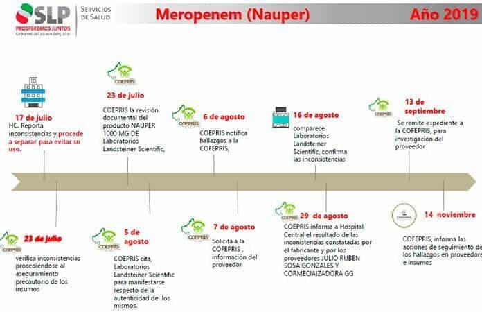 Una investigación de la Comisión Estatal para la Prevención de Riesgos Sanitarios (Coepris) reveló la compra por parte del Hospital Central Ignacio Morones Prieto de otro medicamento falsificado, Meropenem, en la que confirma que proveedores frecuentes de la institución no sólo presentan anomalías fiscales, sino también indicios de falsificación de documentos y registros sanitarios.