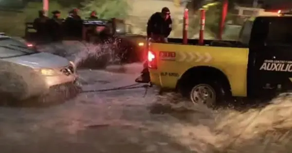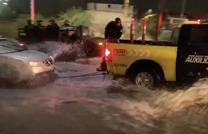 La alcaldía capitalina reportó cierres viales debido al anegamiento: el puente Manuel José Othón, el puente Naranja sobre Salvador Nava y el de Pemex y los bulevares de los ríos Santiago y Españita.